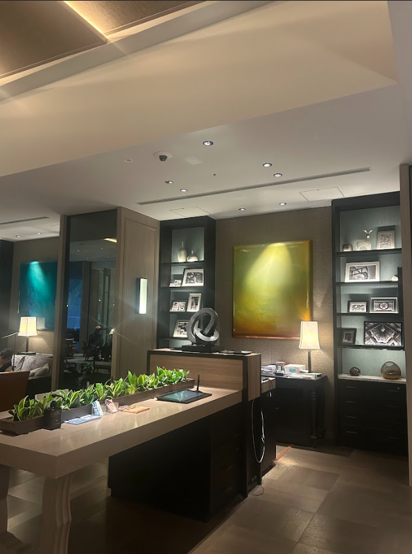 大理石のテーブルやアート作品が印象的に配置されていて、まるで上質なギャラリーの中にいるような感覚。
