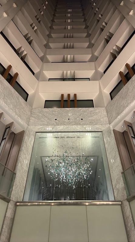 客室フロアが何層にも重なり合う光景は壮大で、中央には光を受けて輝く美しいオブジェが吊り下げられていました。