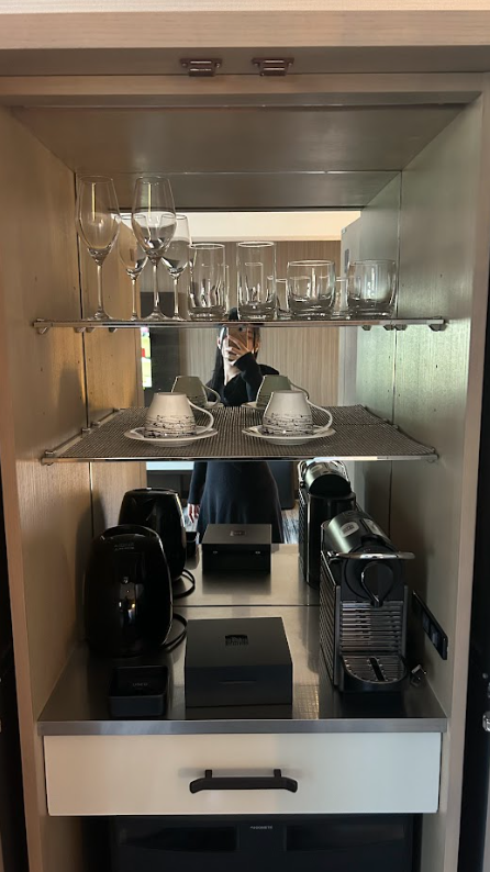 客室の一角には、グラスやコーヒーセットが美しく並ぶドリンクコーナーが設けられていました。