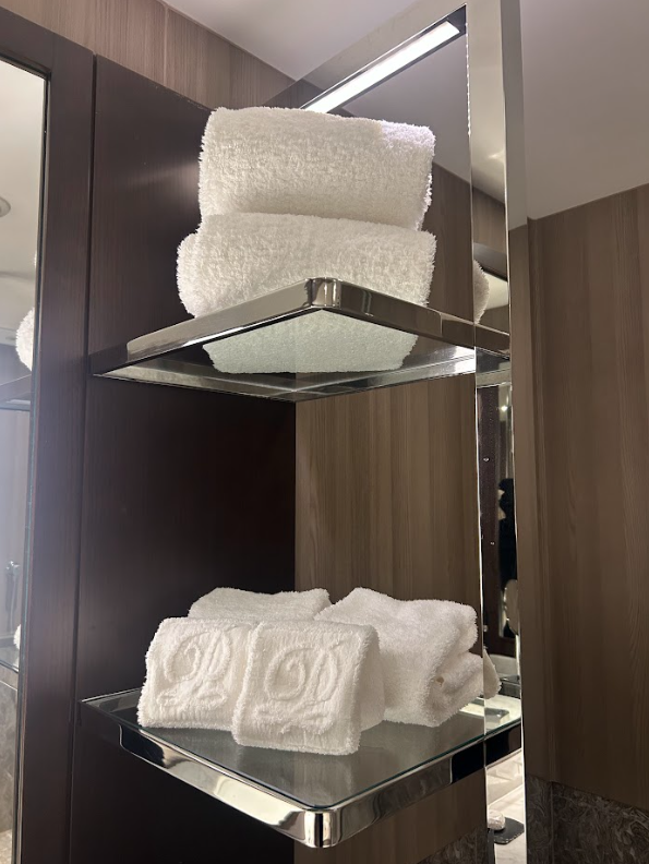 洗面スペースには、ふかふかのバスタオルとフェイスタオルがきれいに整えられて並んでいて、見た目からも清潔感と上質さが伝わってきました!
