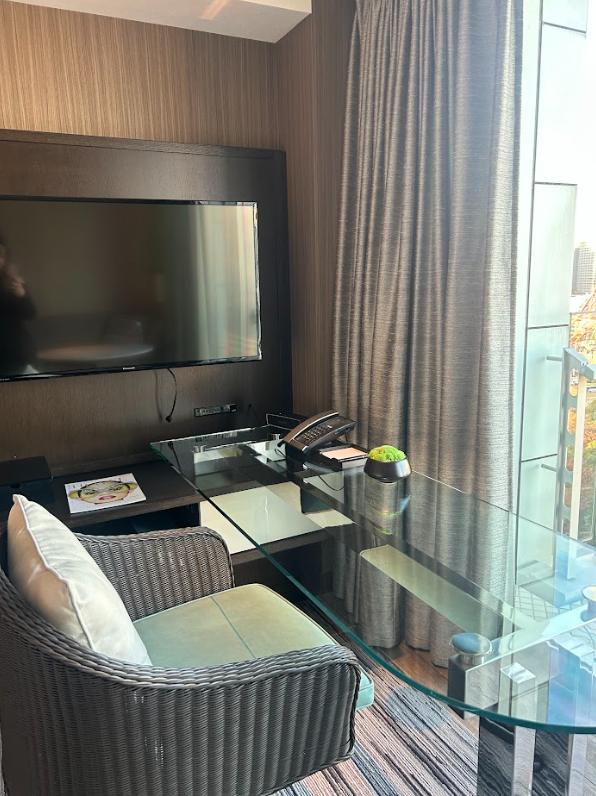 お部屋には大きなガラステーブルのデスクと、ゆったりと座れるチェアが用意されており、ちょっとした作業をしたり、旅の予定を整理したりするのにも十分な広さでした!