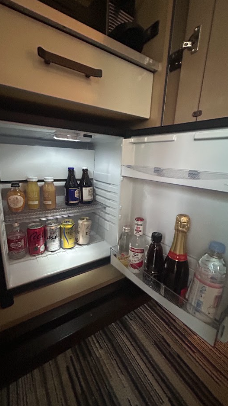 冷蔵庫には、ビールやワイン、シャンパン、ジュース、炭酸飲料などがずらりと並んでいて、夜景を楽しみながら部屋でゆっくり乾杯したくなるラインナップ🍷