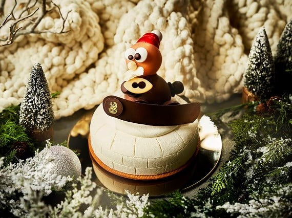 ホテルロゴ入りのスノーボードに乗るサンタが目を引く「ムースケーキ」。クッキー生地にアーモンドスポンジ、ストロベリージュレ、ストロベリークリームが重ねられており、それをバニラムースで包んでいます。甘酸っぱいイチゴの風味と軽い口どけが楽しめる一品です。