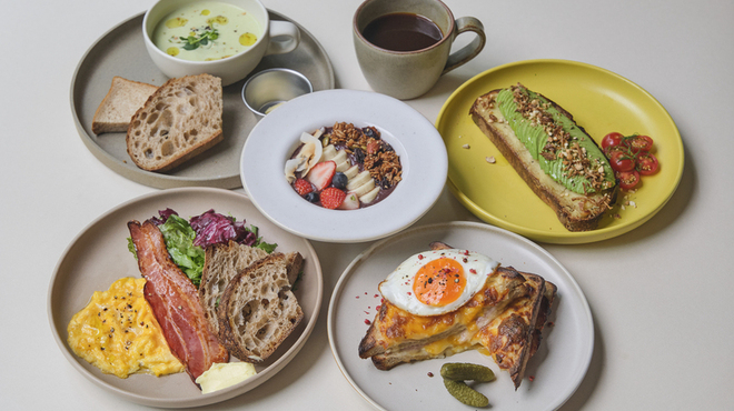 明るく開放感のある店内は56席(うち個室16席)を擁し、朝のオフィス街に溶け込む木の温もりを感じるエントランスが、都市の真ん中にいながらどこかほっとする安心感を与えてくれます。朝8時から提供される平日限定のモーニングメニューは、旬の食材を組み合わせたフードが中心。創業当時から人気のカンパーニュを使った「アボカドタルティーヌ」(1,280円)は、なめらかなマッシュポテトとアボカドをたっぷりとのせ、オリーブオイルで仕上げたシンプルながら贅沢な一品で、SNSでも話題のメニューです。自家製焼き菓子やスープとのセットでゆったり過ごすのもおすすめ。兜町の新しい朝の定番として、今最も訪れたいカフェのひとつです。
