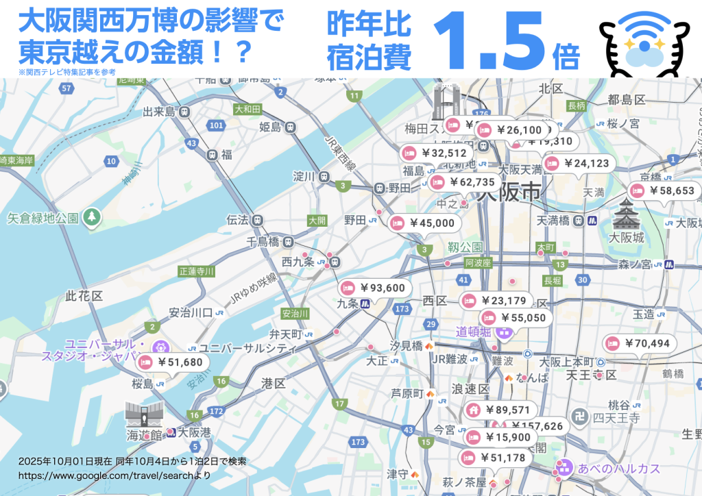 昨今万博の駆け込み需要の影響で、金土日の大阪近郊の宿泊費が急激に高騰しています。