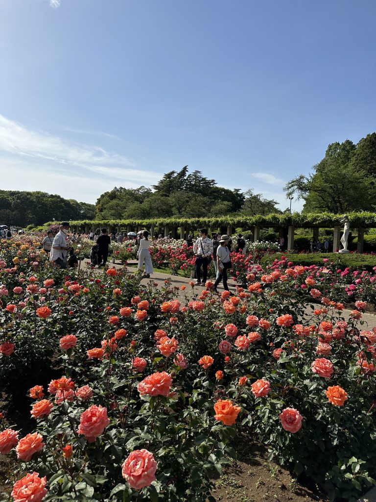 色とりどりのバラが一面に広がる神代植物公園のバラ園。
