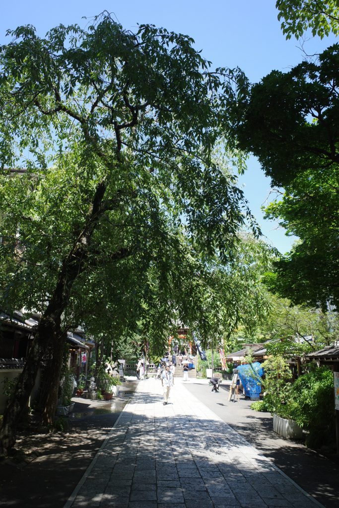 石畳に差し込む木漏れ日、風に揺れるのれん、そして境内へと続く静かな階段。